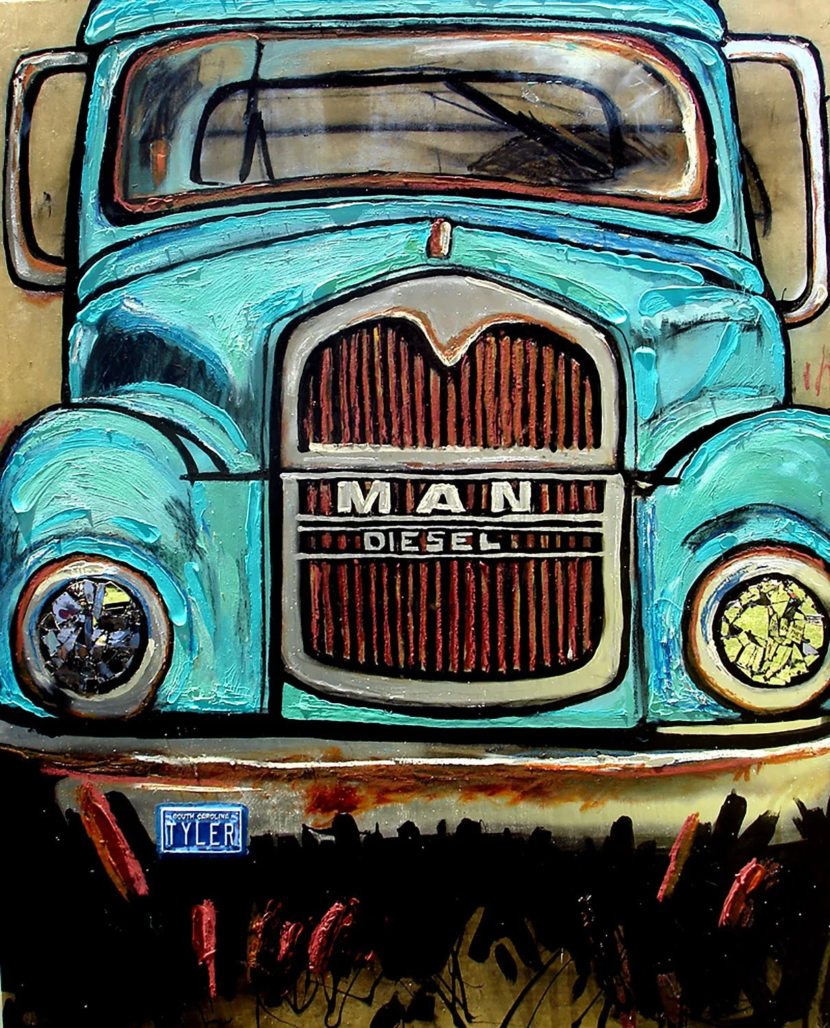 Oil, charcoal and spray paint on shipping wood panel